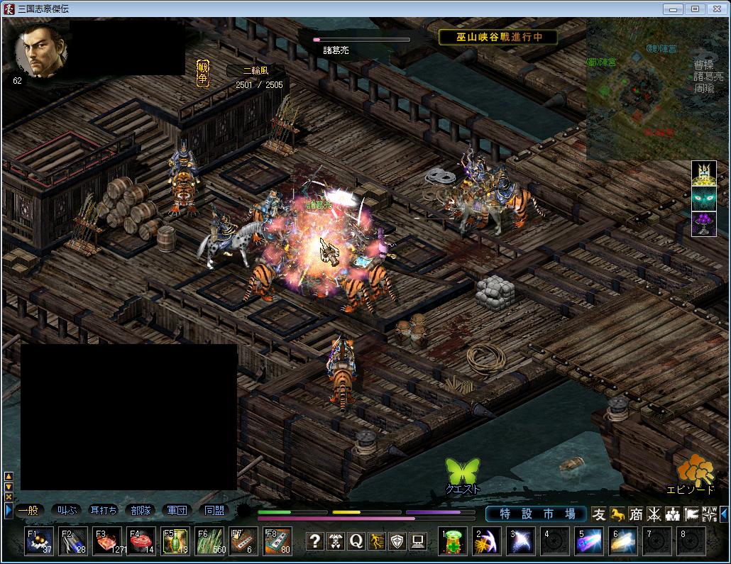 読んでて思ったんだけど、三国志の主役は劉備、曹操当たりなわけだが、実際活躍したのは諸葛亮、最後に勝ったのは司馬懿なわけですよ。 なのにこのゲームの諸葛亮、司馬懿、陸遜は茨過ぎるwww もうちょっと補助系軍師に華やかさを! ということでね、うちの司馬懿のレベル上げを弘農でしてました。 司馬懿の策略弱すぎますねwww武術すげぇけどw で、巫山峡谷戦 倉庫に魔力が一個あったので、最初はそれを飲んで参戦。 人が密集してると行きたいとこ行ってくれないよね。 気がついたら赤い服の人たちの中に猛スピードでつっこんでるわけですよw 目の前に周喩なんていたらもう即死ですよ。 ちょ、カ○イン!!って思った瞬間 「うぉぁ゛ーーーー!!!」 って死んでますからね。 策略痛いです。 後半はずっと船にいました。 もうNPC諸葛亮と周喩ぼっこぼこですよ。相手が反撃してこないとなると強気です。 けど、入ってきた敵国の人を叩くのを忘れてました。そのほうが業績稼げたのにねorz うちの司馬懿は弱い策略で業績8GETしてました。がんばれ司馬懿!落石が君を待っている! 今日の戦果 業績2→0→8 これではだめです。精進します>< 最後に今日の戯れ 大前伍長だけでなく、サブキャラの鄧艾も女子(おなご)が大好きです^^ 地面の赤いのは血ではなく戯れに使ったケチャップです。