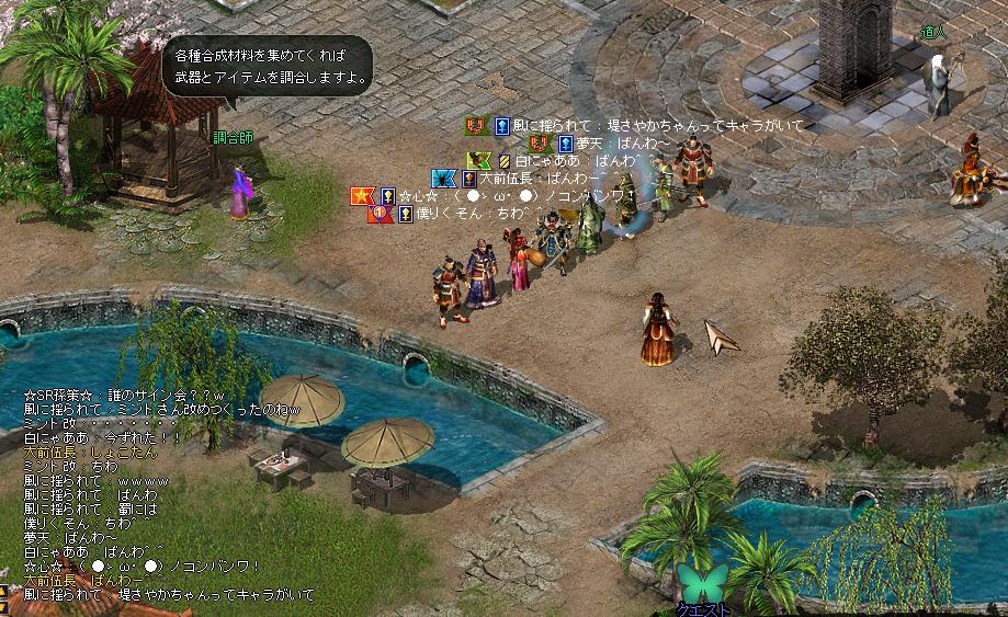 「そろそろ寝ますね」 と、商売用のサブキャラで倉庫に行ったら 蜀の皆様が観光にw風に揺られてユカイな仲間達!白陽さんもいた^^ なんかすんげぇ盛り上がってました。 ので、曹操にチェンジして一緒に呉まで行ってきましたw 入ったとたん目に付いたのが、僕りくそんさん! 司馬懿を一時扱っていたわしにとっては、神のような存在です。初めてなまで見ました^^ ☆心☆さんにはいつも痛い目見せられてるのでよく知ってますw SR孫策さん、英史さんを加えて記念撮影! 風に揺られてさんはなんか一人変なことを口走っていますw 魏に戻ってから、うちの司馬懿が束縛を試したいというのでいろんなレベルのキャラで試し束縛。 結局寝たの4時orz PR